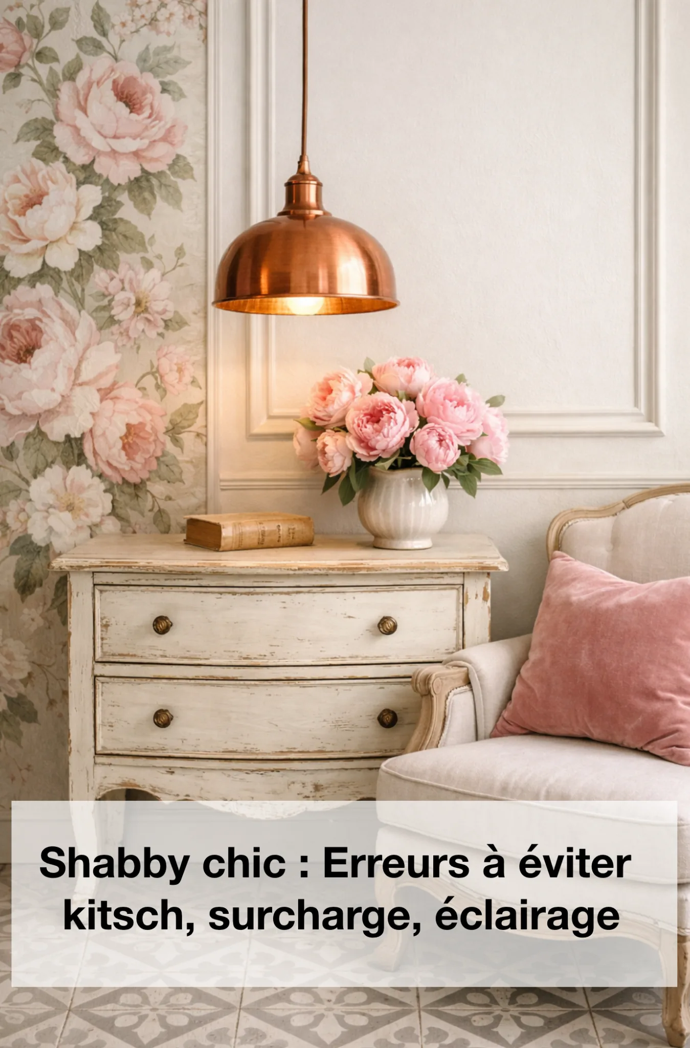 Le shabby chic devient immédiatement “crédible” quand les matières racontent quelque chose : velours (cocon), lin (naturel), bois patiné (vécu), cuivre (chaleur). Un luminaire cuivre au-dessus d’un motif floral, par exemple, donne une lecture chic plutôt que “trop romantique”.